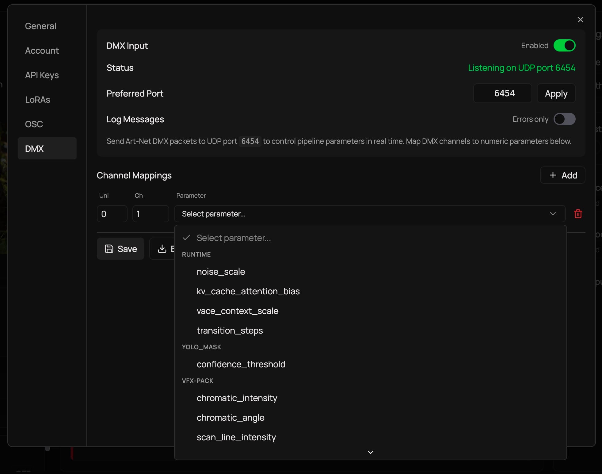 Each loaded pipeline adds its own numeric parameters to the mappable set. You configure the mappings in Scope's settings panel, choosing which universe and channel controls which parameter.