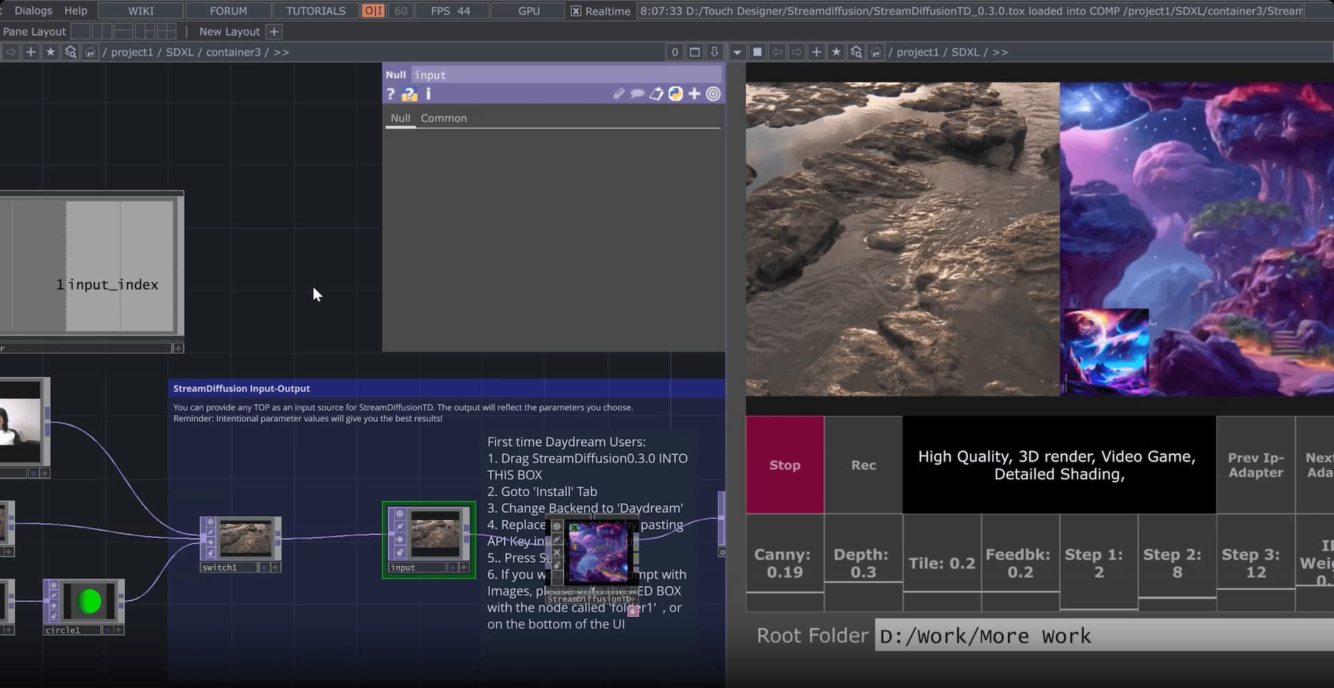 The fastest way in, and the one we've been recommending to pretty much every TouchDesigner creator who asks, is Daydream SDXL Easy Quickstart File. It's a ready-to-use .tox that wires StreamDiffusionTD to your Daydream API key with a click-and-drag install, and it gives you real-time prompt editing, multiple ControlNets, IP-Adapter image prompting from folders, and input switching for webcam, video files, and TouchDesigner network sources out of the box. It needs TouchDesigner 2023 or newer on Mac, and 2025 or newer on Windows for the SDXL Turbo path.