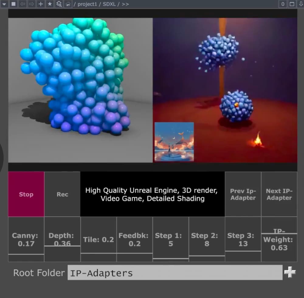 The operator exposes the parameters that matter for live work (prompt, seed, ControlNet weights) instead of hiding them behind a black box, so you can drive generation from audio, sensors, cameras, MIDI, OSC, or whatever else you already have wired up.